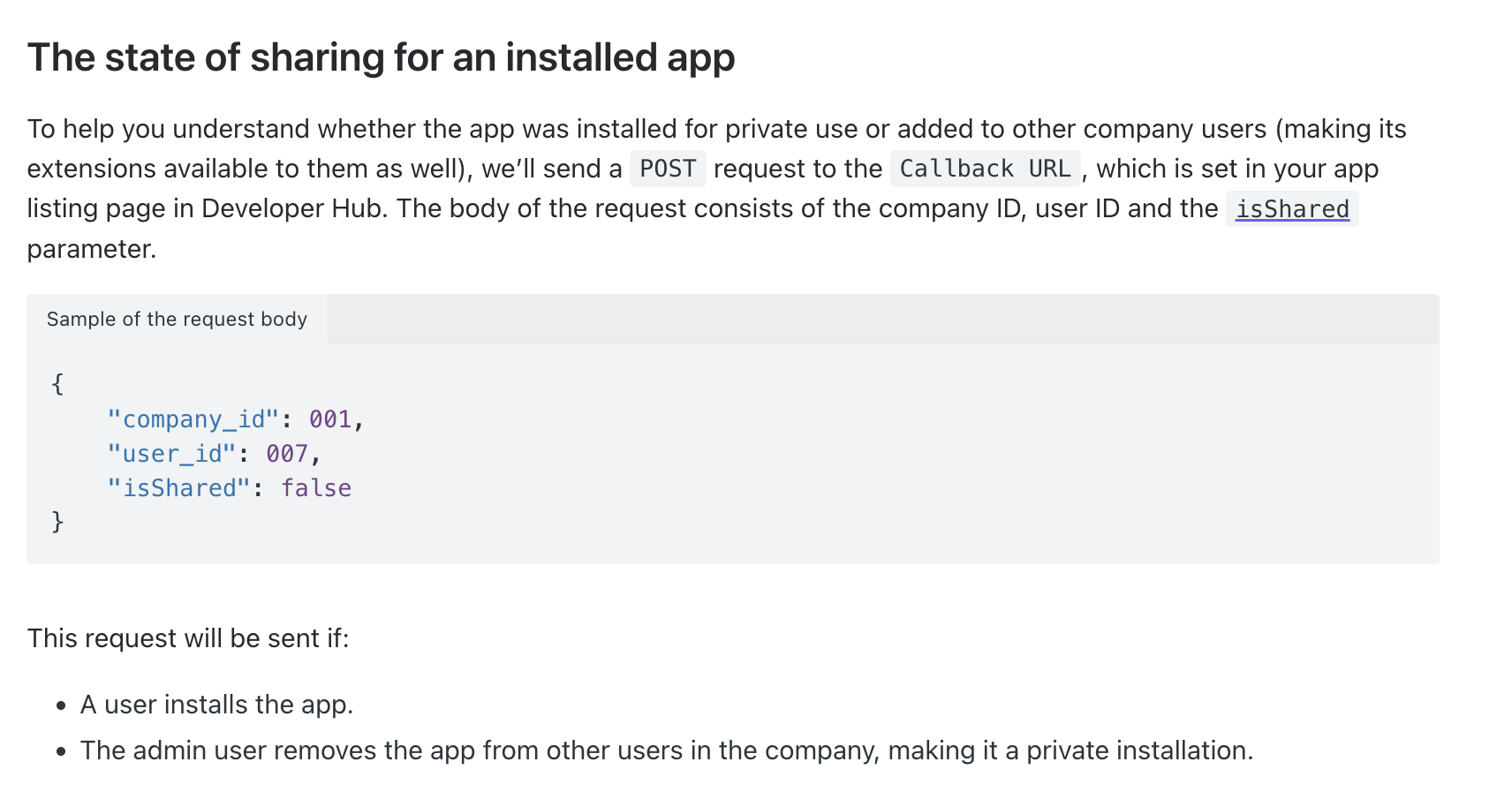 this is a bit confusing with shared apps. Those install/remove callbacks don’t always trigger the way you’d expect, especially for private apps using App Sharing. They usually work better for full app installs, not when access is given or removed for individual users. What you’re doing with the isShared flag actually makes sense, and a lot of people rely on that instead. You could also double-check your webhook setup, but if everything looks fine, it’s probably just a limitation rather than an issue on your side
